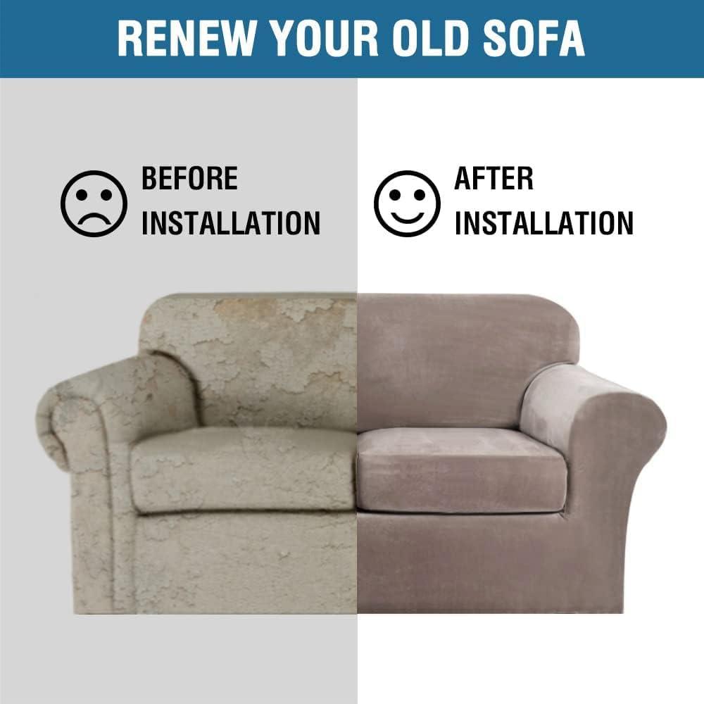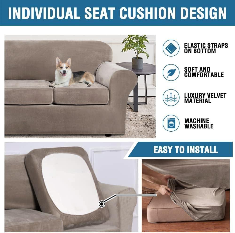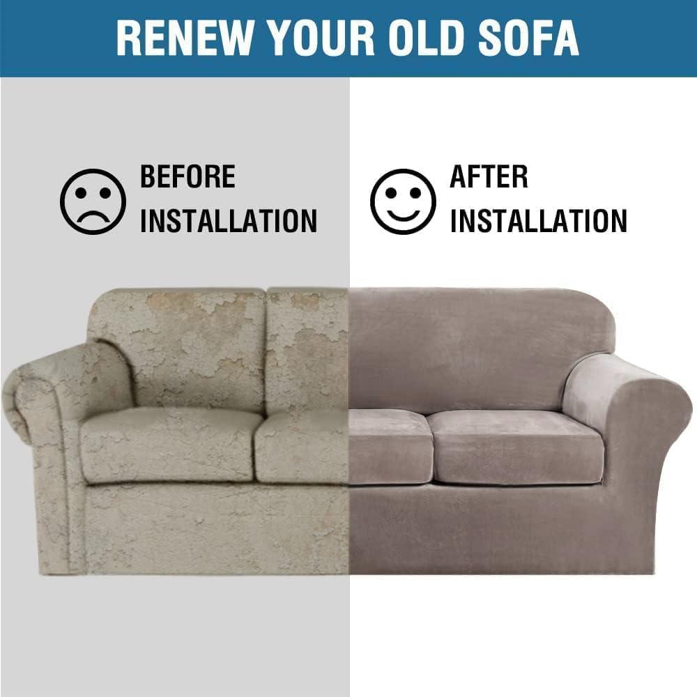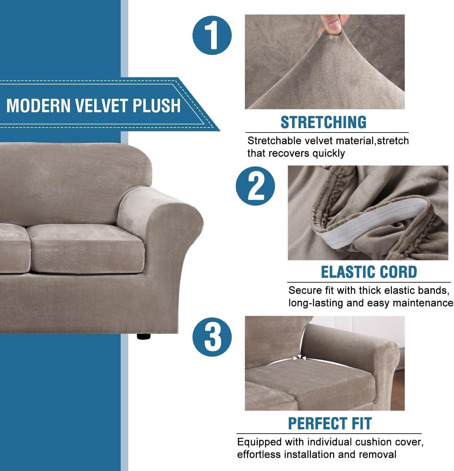 GREAT FIT: This innovated 4 Piece sofa couch cover is crafted from luxurious velvet plush fabric, including 1 piece of base cover and 3 piece of cushion covers. Sofa slipcovers (fit sitting width between 72-90 inch). Feature one-size-fits-most, kindly measure before ordering