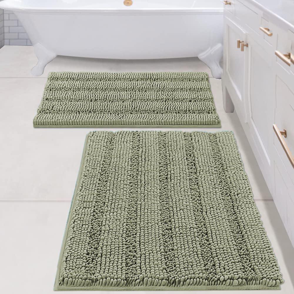 H.VERSAILTEX Navy Blue Bathroom Rugs 2 Piece, Bath Mat Set Slip-Resistant Extra Absorbent Soft and Fluffy Striped Chenille Bath Rugs, Floor Mats Dry Fast Machine Washable (20″ x 32″/17″ x 24″)(Eucalyptus Green)