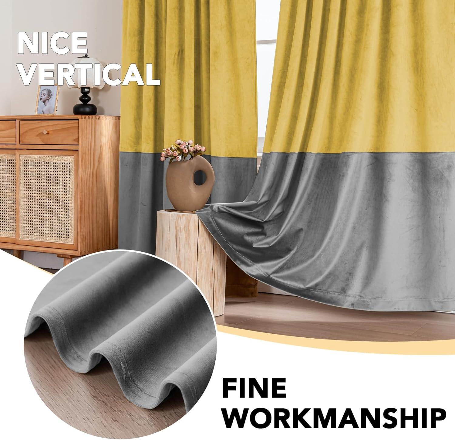 H.VERSAILTEX Velvet Patchwork Curtains Thermal Insulated Soundproof Room Darkening Drapes Rod Pocket Window Treatment Panels for Living Room Bedroom,2 Panels,Brown/Mustard,52" W x 84" L(Yellow/Grey)