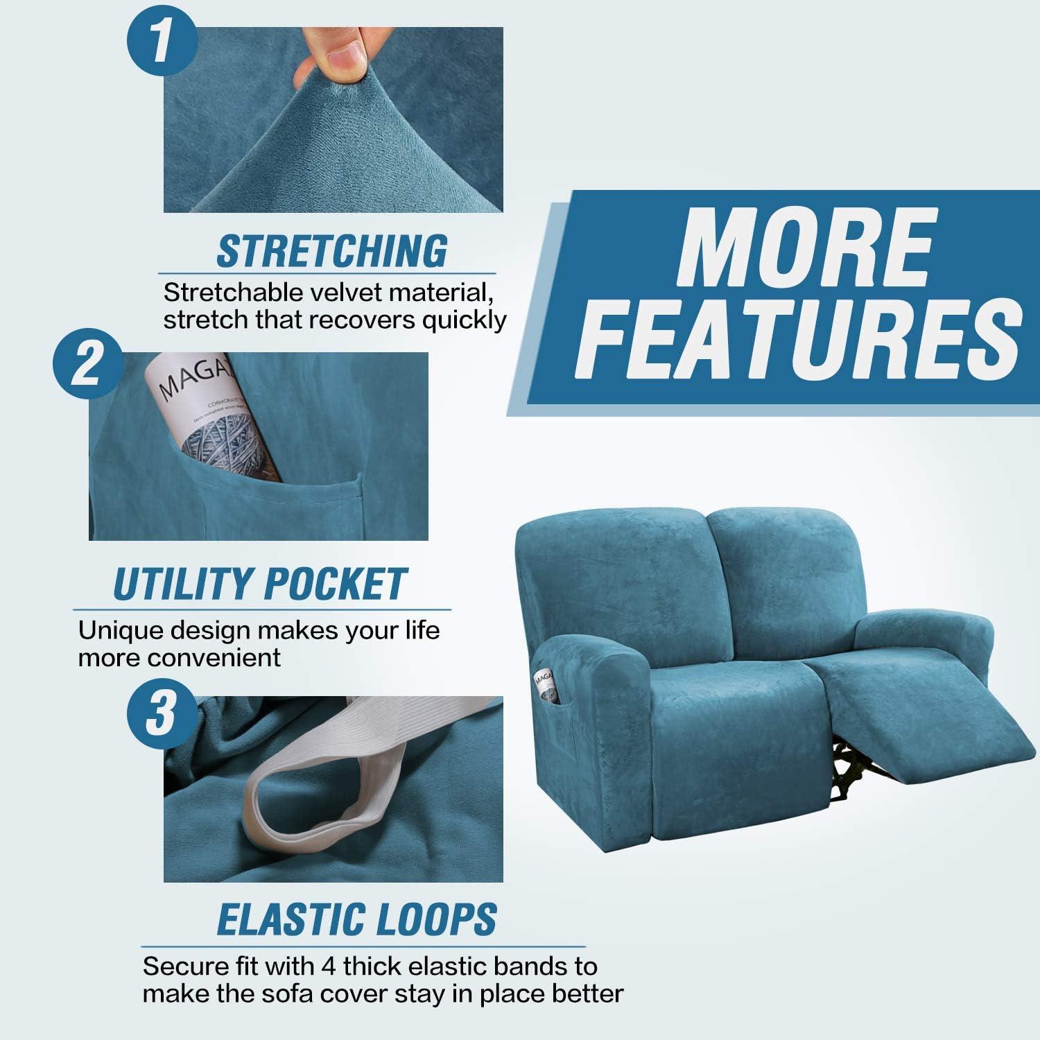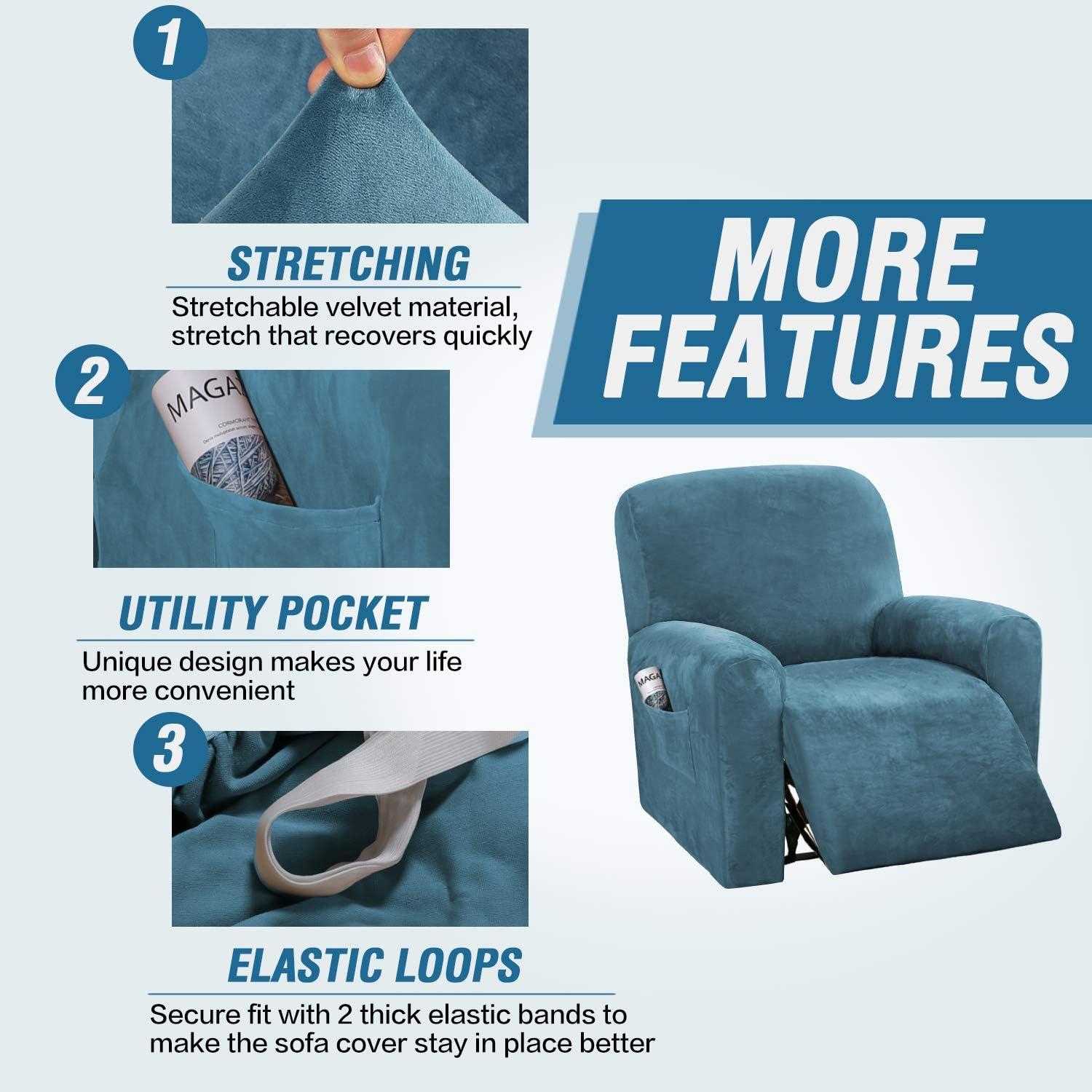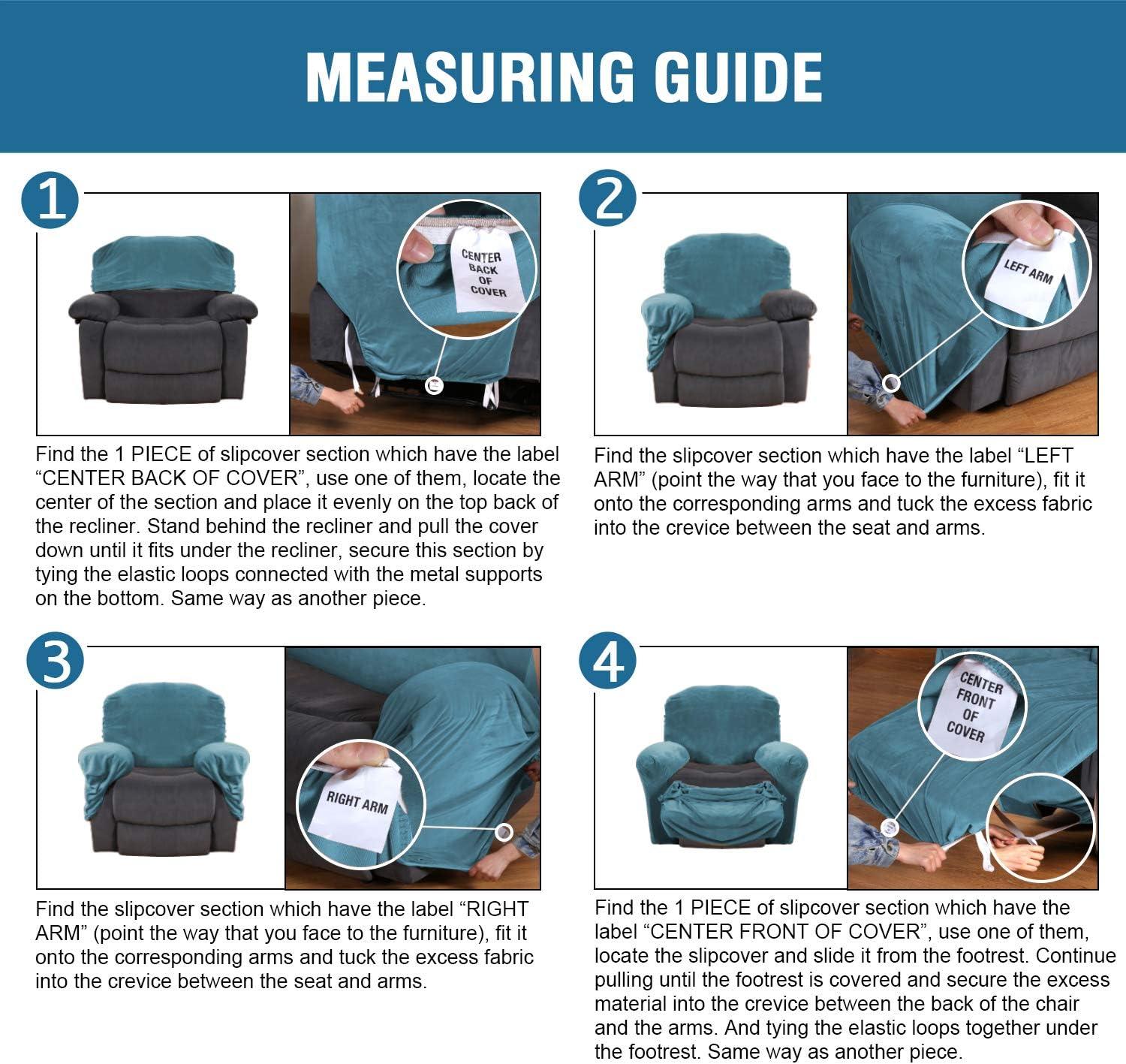 GREAT FIT: This innovated 4 Pieces recliner chair couch cover is crafted from luxurious velvet plush fabric, including 2 arm pieces,1 center back of seat piece and 1 center back of cover piece, fit sofa width between 27-41 inch. with right side pocket and continuous footrest. Each seat has two elastic loops at the back corners to be pulled through to the back of the recliner
