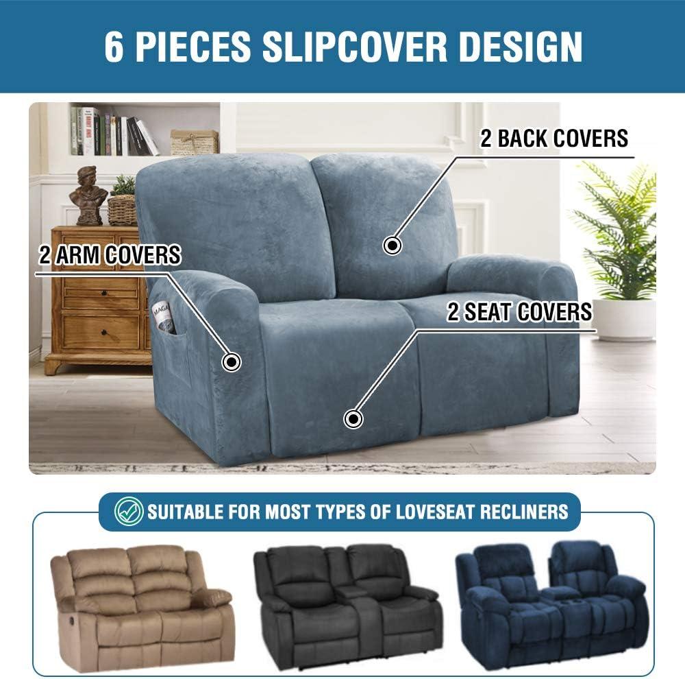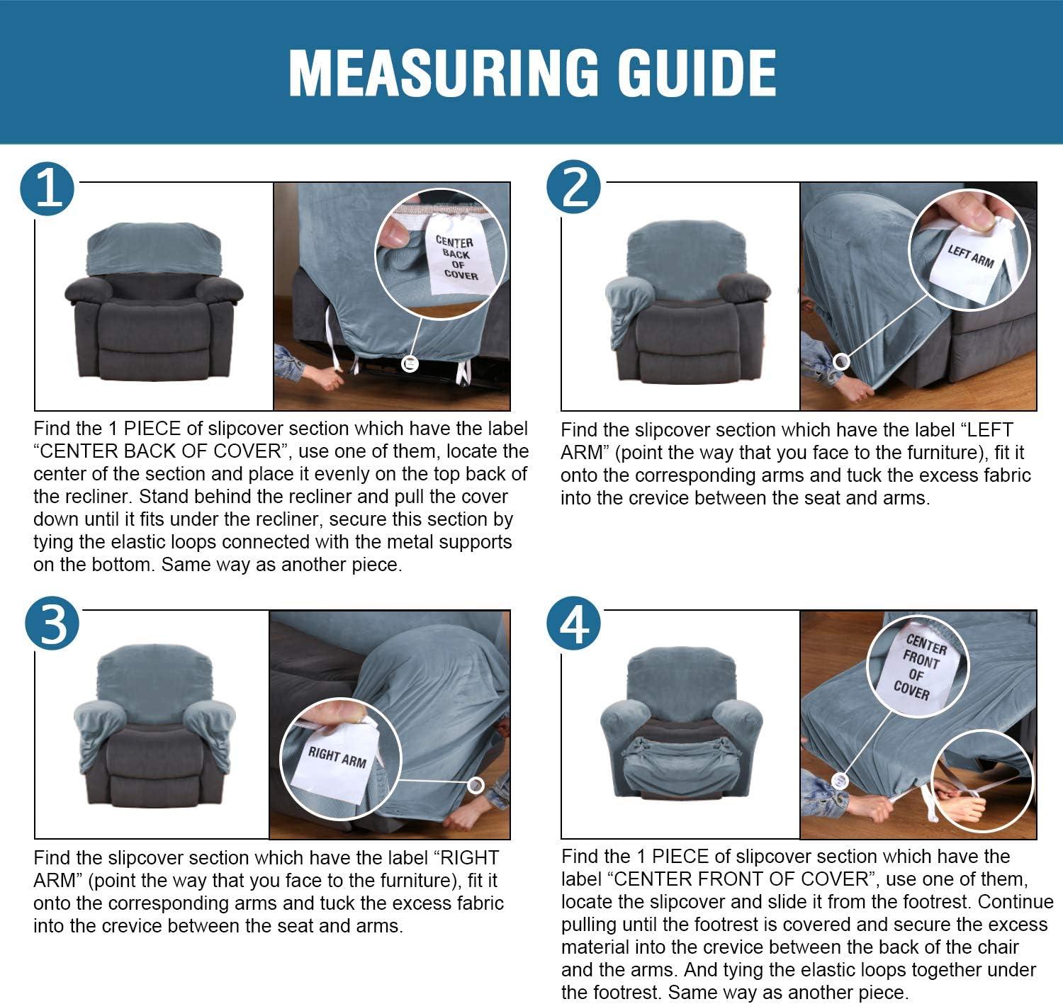 GREAT FIT: This innovated 4 Pieces recliner chair couch cover is crafted from luxurious velvet plush fabric, including 2 arm pieces,1 center back of seat piece and 1 center back of cover piece, fit sofa width between 27-41 inch. with right side pocket and continuous footrest. Each seat has two elastic loops at the back corners to be pulled through to the back of the recliner