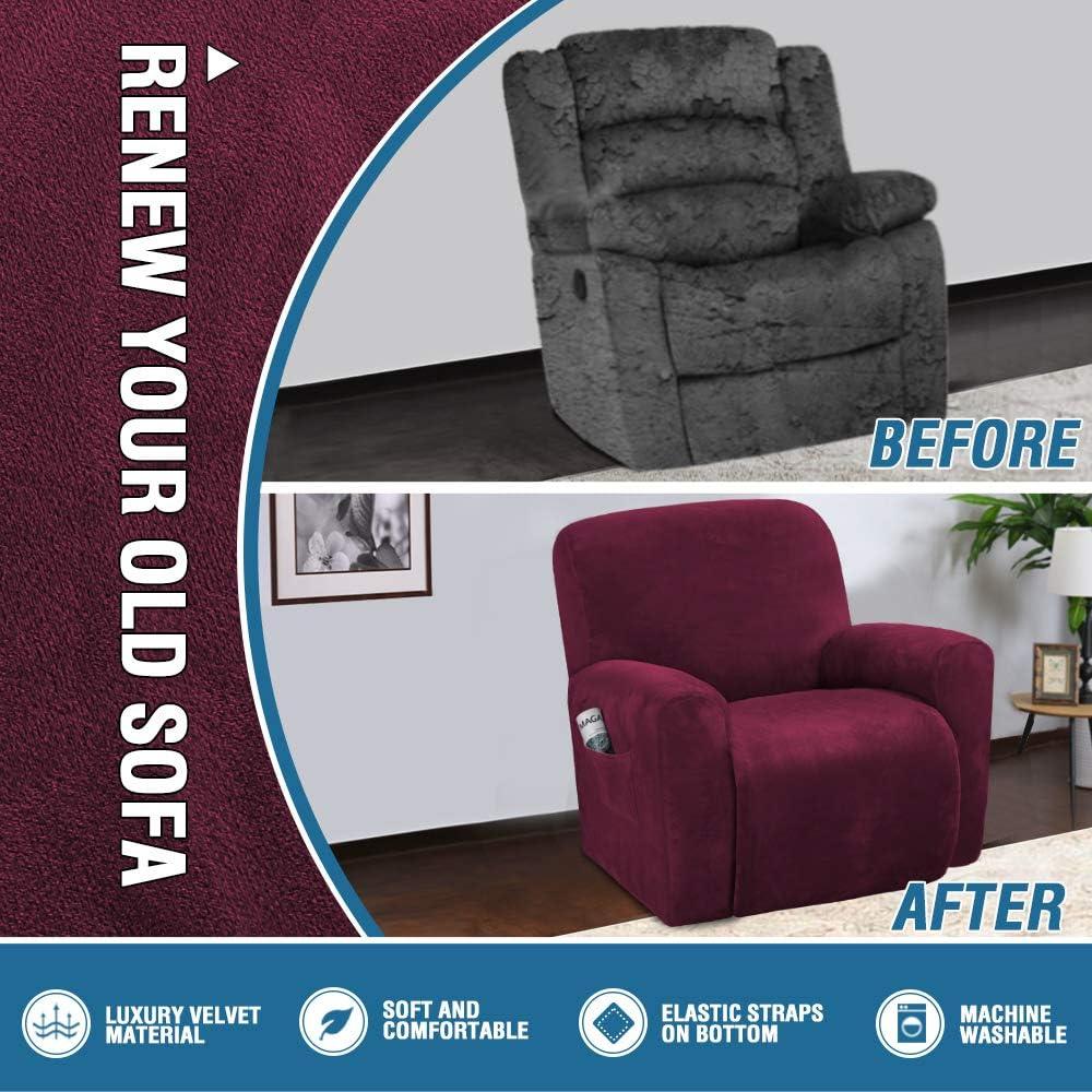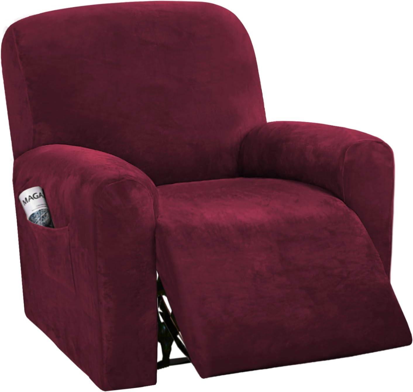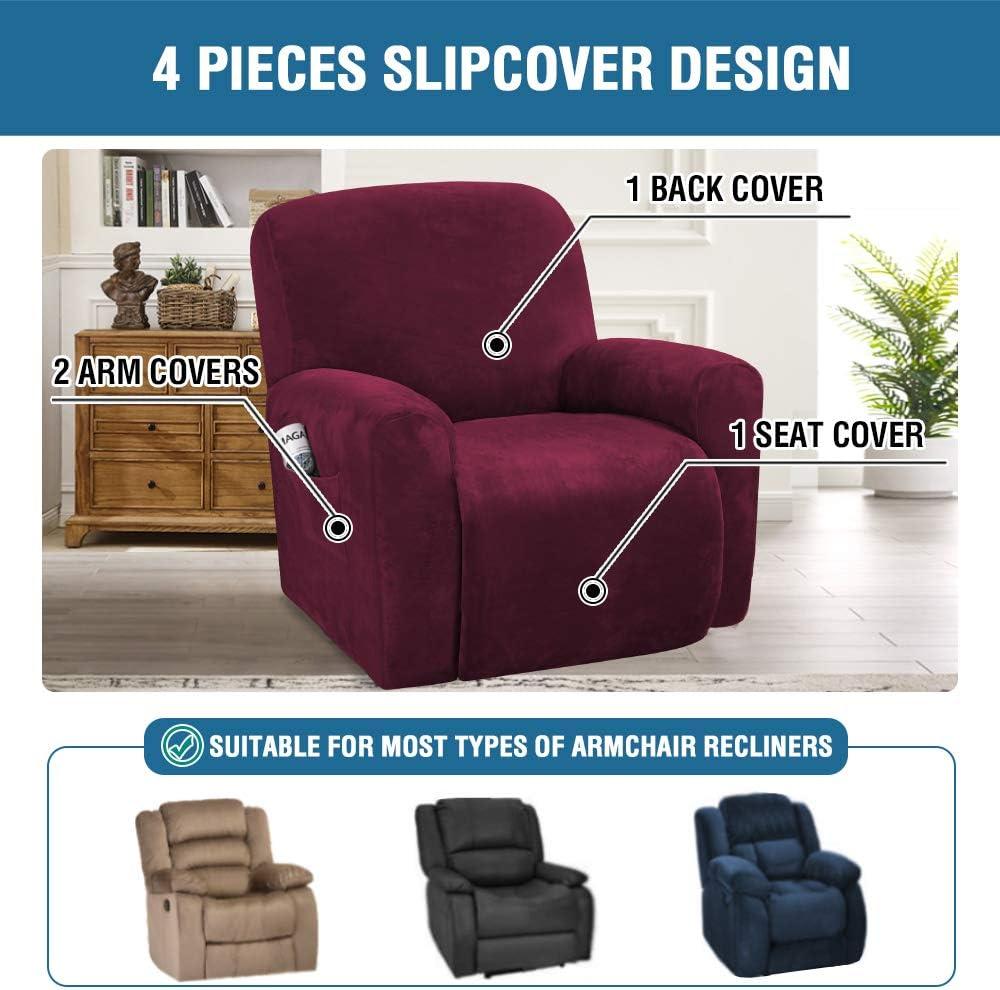 H.VERSAILTEX Velvet Stretch Recliner Couch Covers 4-Pieces Style Recliner Chair Covers Recliner Cover for Reclining Chair Slipcovers Feature Non Slip Form Fitted Thick Soft Washable, French Oak(Wine/Burgundy)
