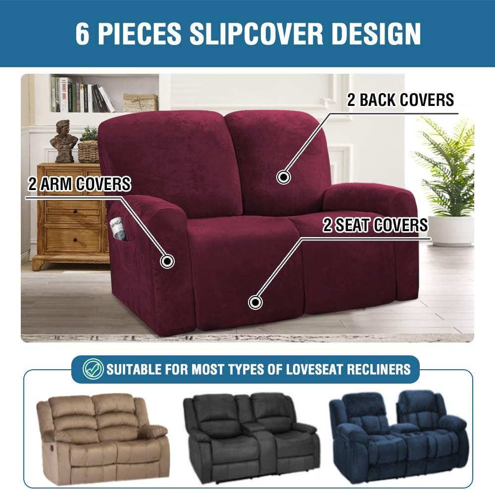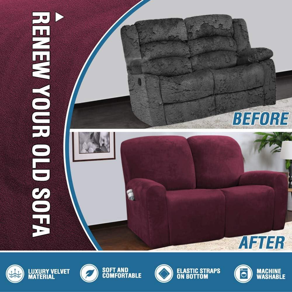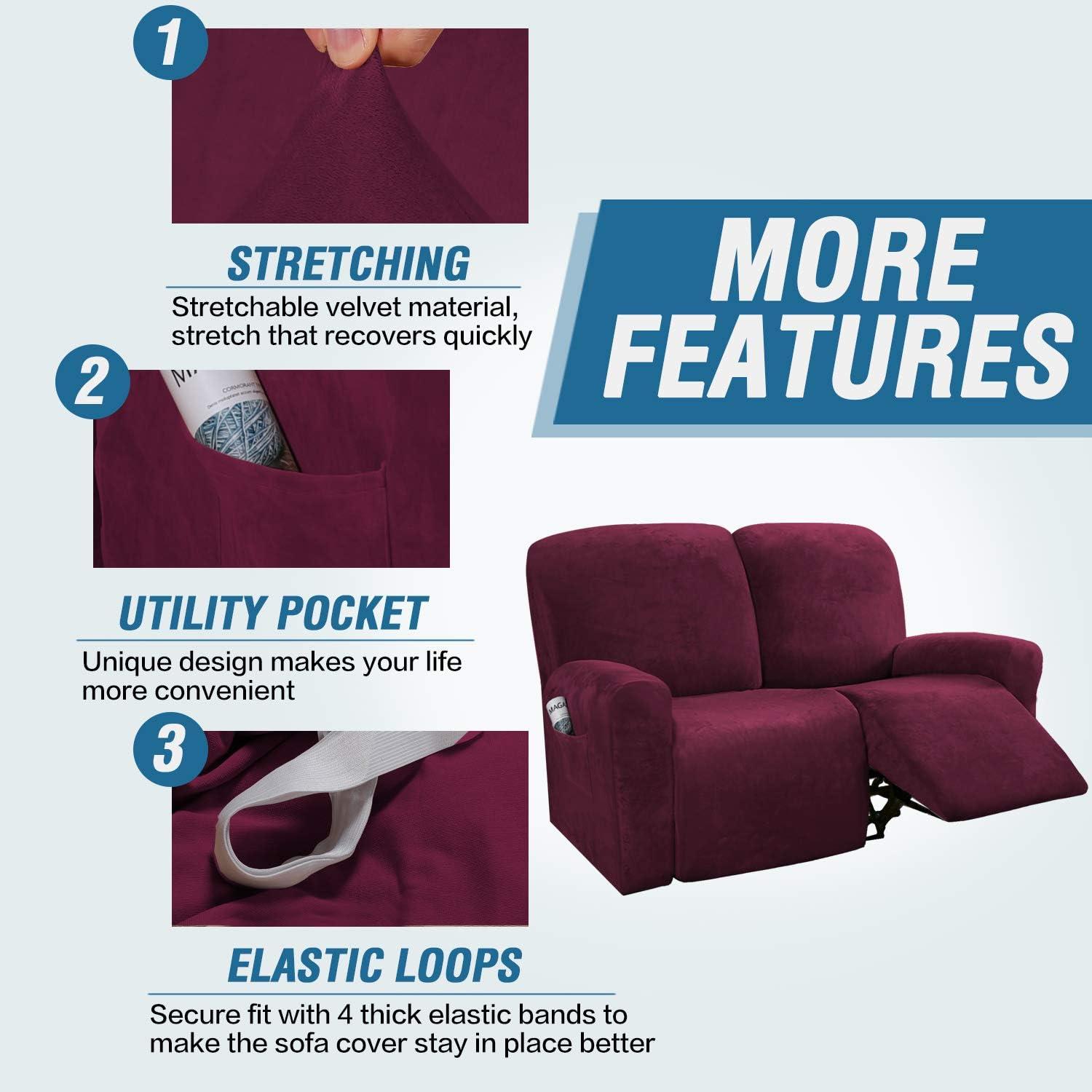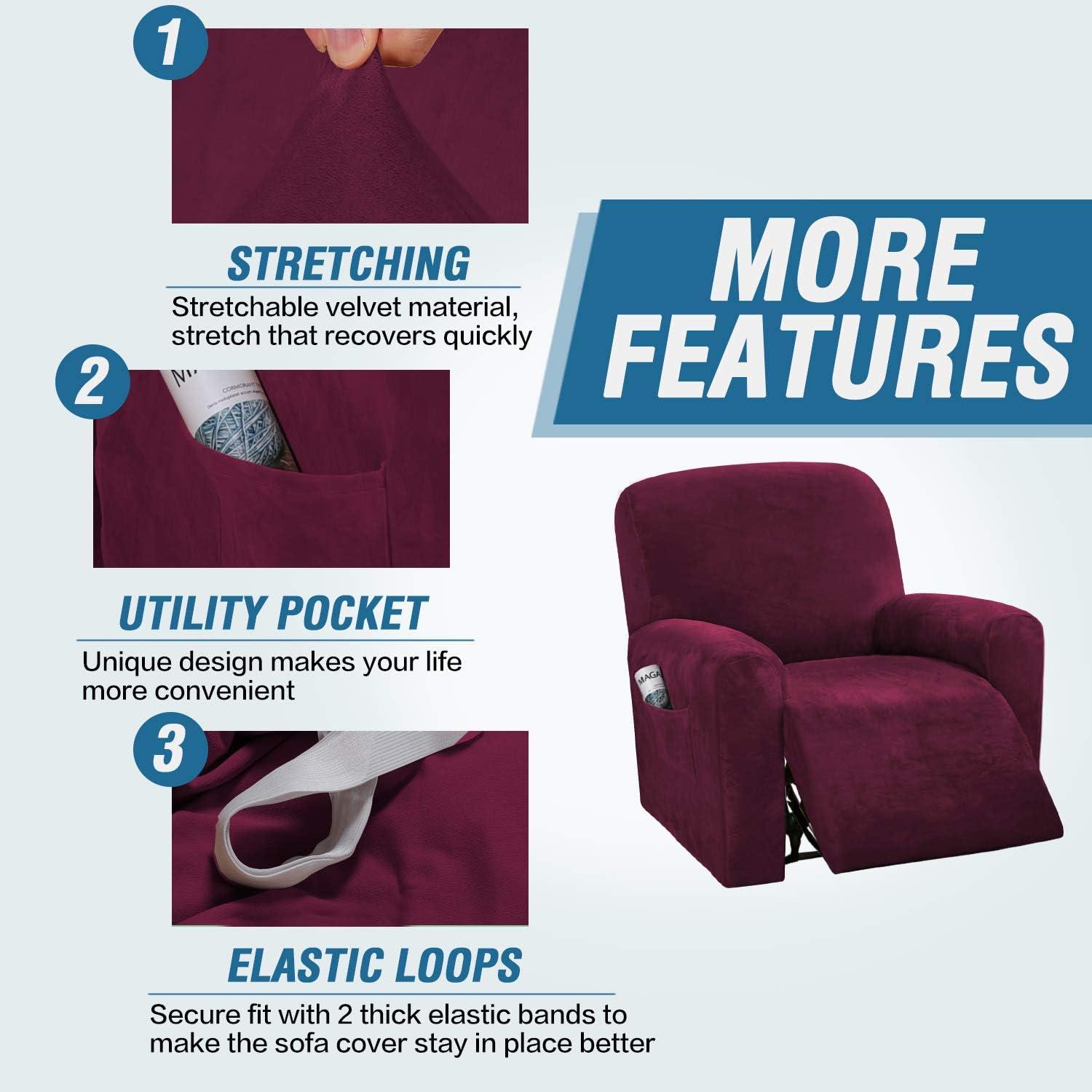 H.VERSAILTEX Velvet Stretch Recliner Couch Covers 4-Pieces Style Recliner Chair Covers Recliner Cover for Reclining Chair Slipcovers Feature Non Slip Form Fitted Thick Soft Washable, French Oak(Wine/Burgundy)