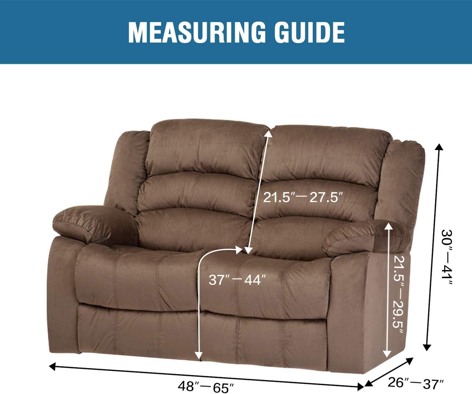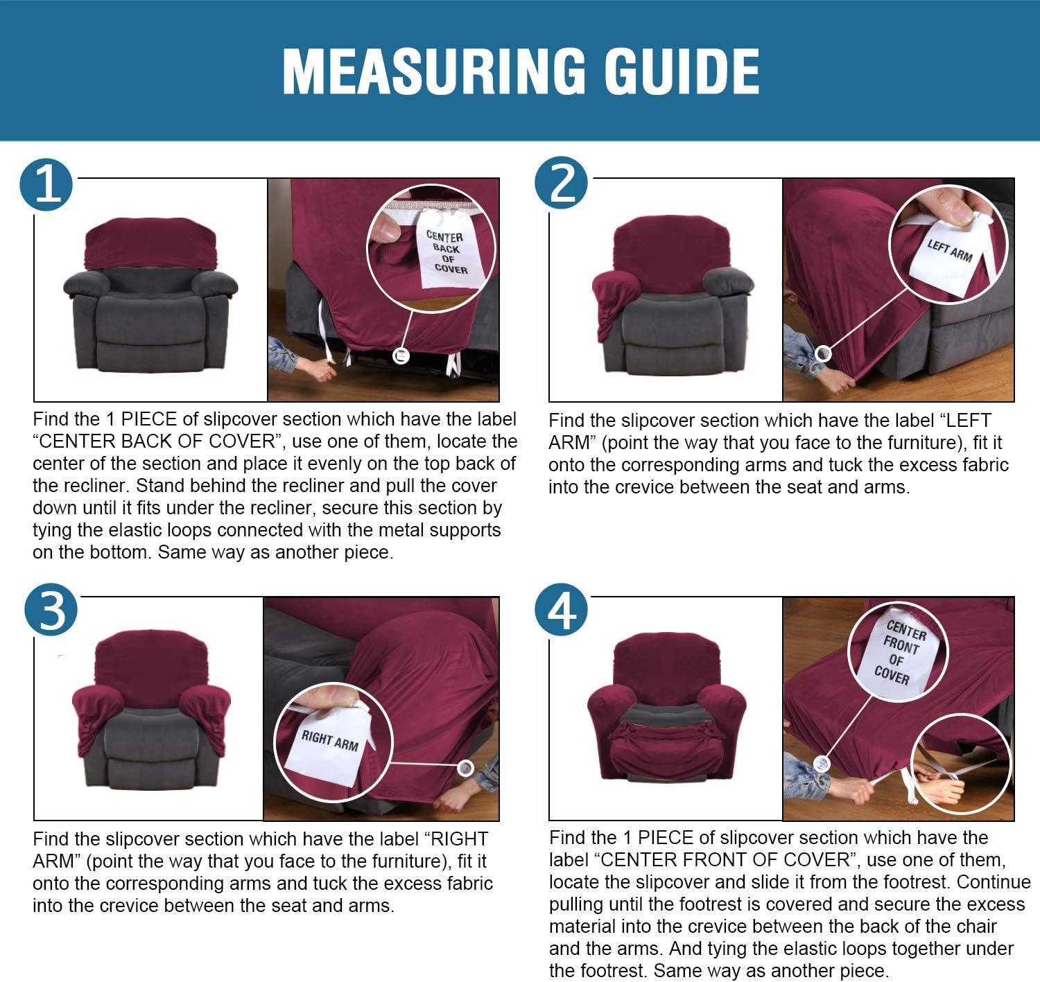 GREAT FIT: This innovated 4 Pieces recliner chair couch cover is crafted from luxurious velvet plush fabric, including 2 arm pieces,1 center back of seat piece and 1 center back of cover piece, fit sofa width between 27-41 inch. with right side pocket and continuous footrest. Each seat has two elastic loops at the back corners to be pulled through to the back of the recliner