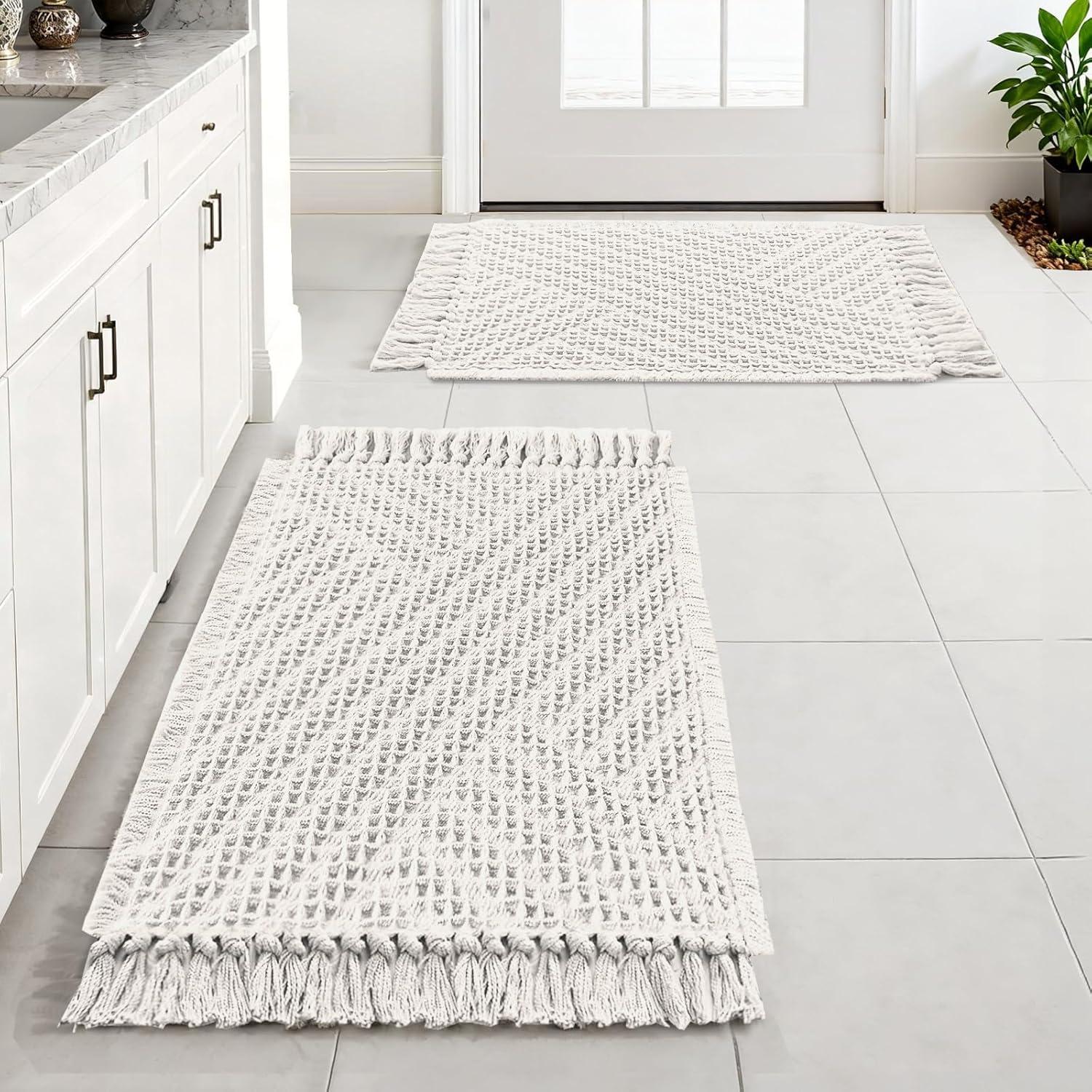 H.VERSAILTEX Waffle Bath Mat Super Absorbent Boho Bath Mat Non Slip Bath Rugs for Bathroom Floor Machine Washable Dry Fast Bathroom Rugs with Tassels (47 x 17 Plus 17 x 24 Inches, Gray)(Ivory White)